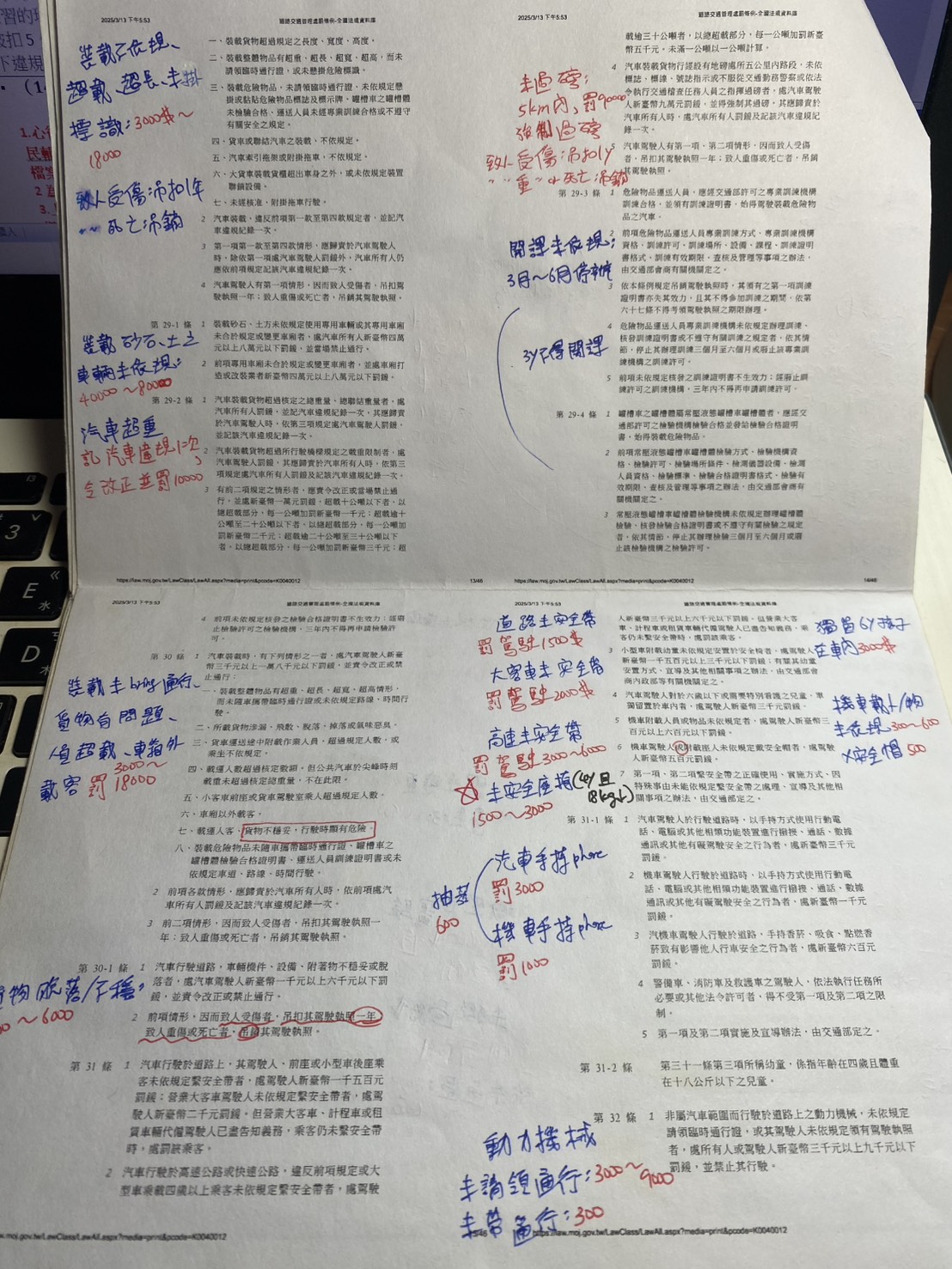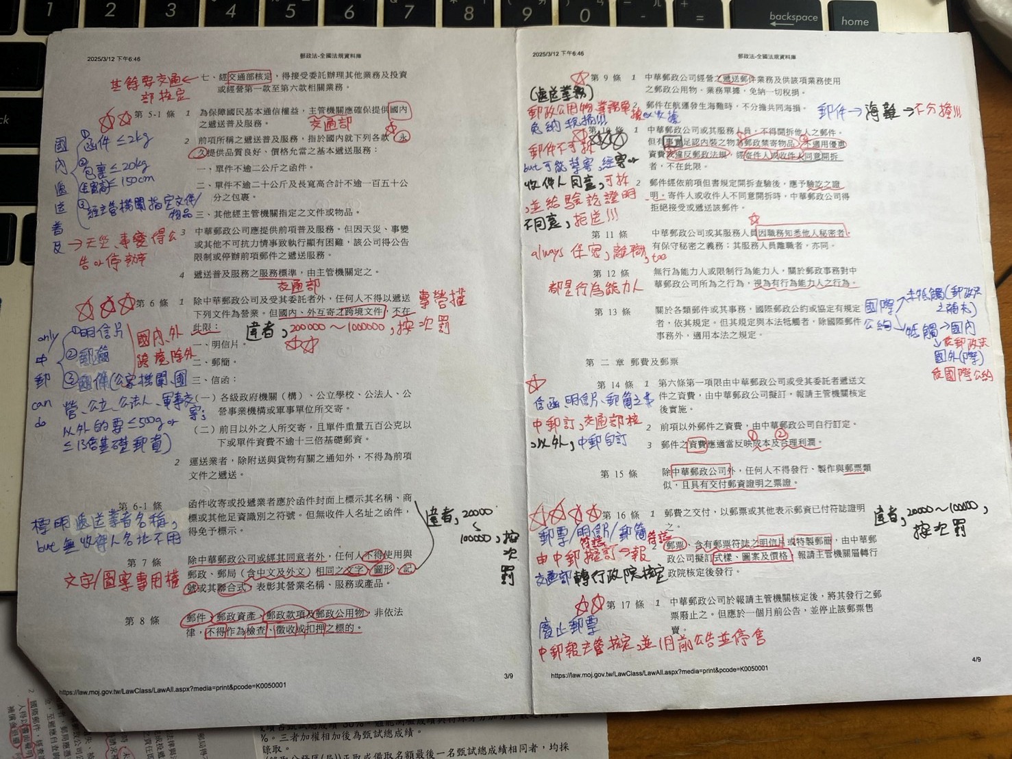 【郵政法規/交通法規】 法歸類的部分題型較單一,要對法規有一定的熟悉度,我習慣在看過後,於空白處寫下白話含意,同時了解法規規範的意義,用邏輯來加強記憶; 交通法規則較死板,需花時間背誦,平時騎車可多留意交通法規規定,將其活用於情境中,更容易加深記憶。另外,教材中整理的表格很清楚, 搭配起來可快速理解不同專業名詞的差異。