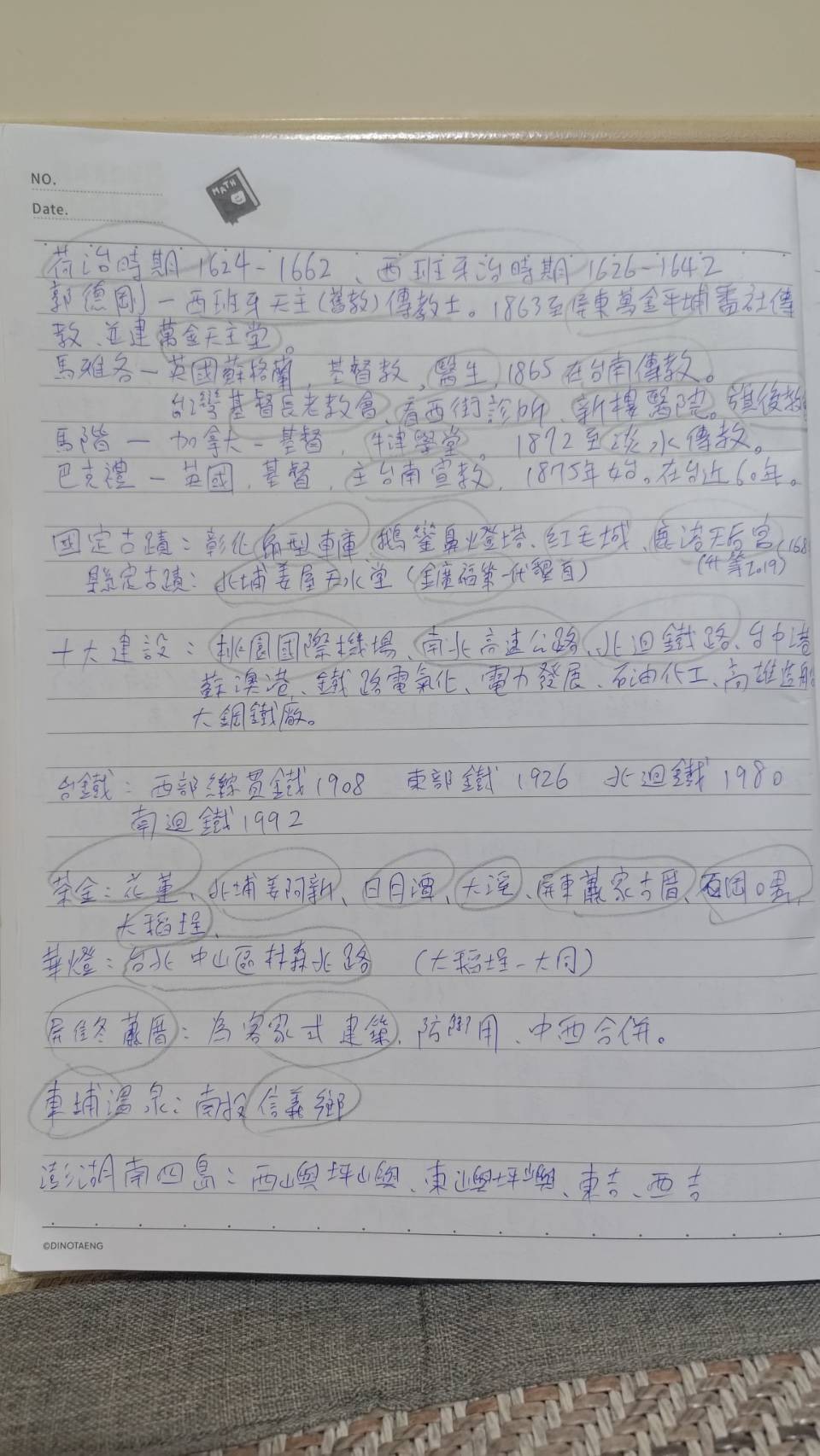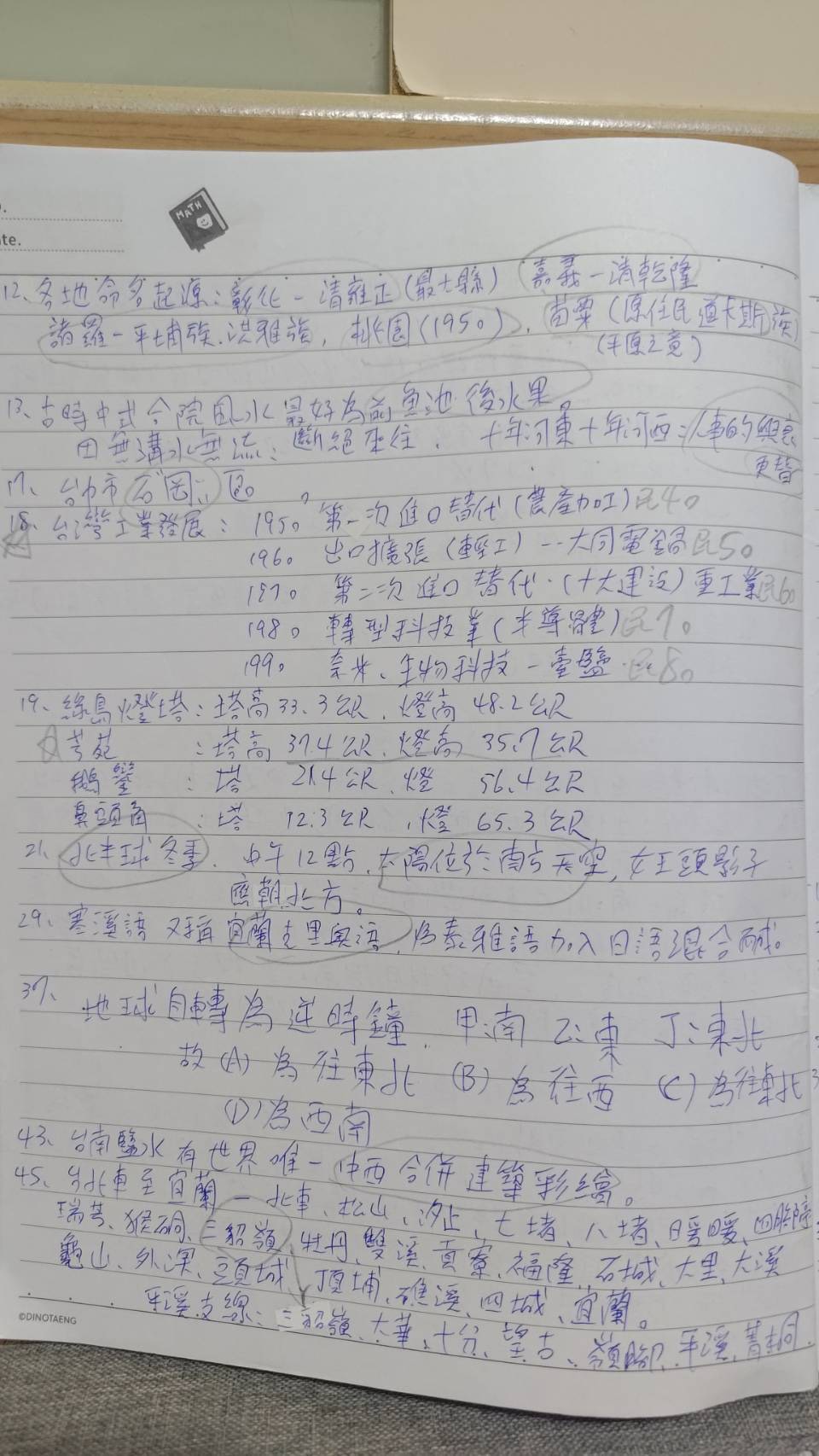 【臺灣自然及人文地理】 地理是決勝關鍵,除了課程跟參考書上的每個重點架構都要清楚(如地圖資訊、地形、氣候..等等)最好在這樣的架構下再擴大知識範圍 (如:1000塊背後是玉山及帝雉,這時就要去查2000元背後是南湖大山及櫻花鉤鮭,或高鐵通車時間台北站為96年3月2日,就要把其他車站的通車時間一併查出來), 然後不斷做題,把每個選項搞懂,把容易讓自己猶豫不決的題目寫在筆記上,如果題目不夠,就去阿摩找來做,地理是我做最多筆記的科目, 總計應該有6本,我把每一回重點題目抄下來,答案如果有不懂就上網查詢資訊。 考前希望可以分數落在80以上,考後確實有86.5分。【筆記1】【筆記2